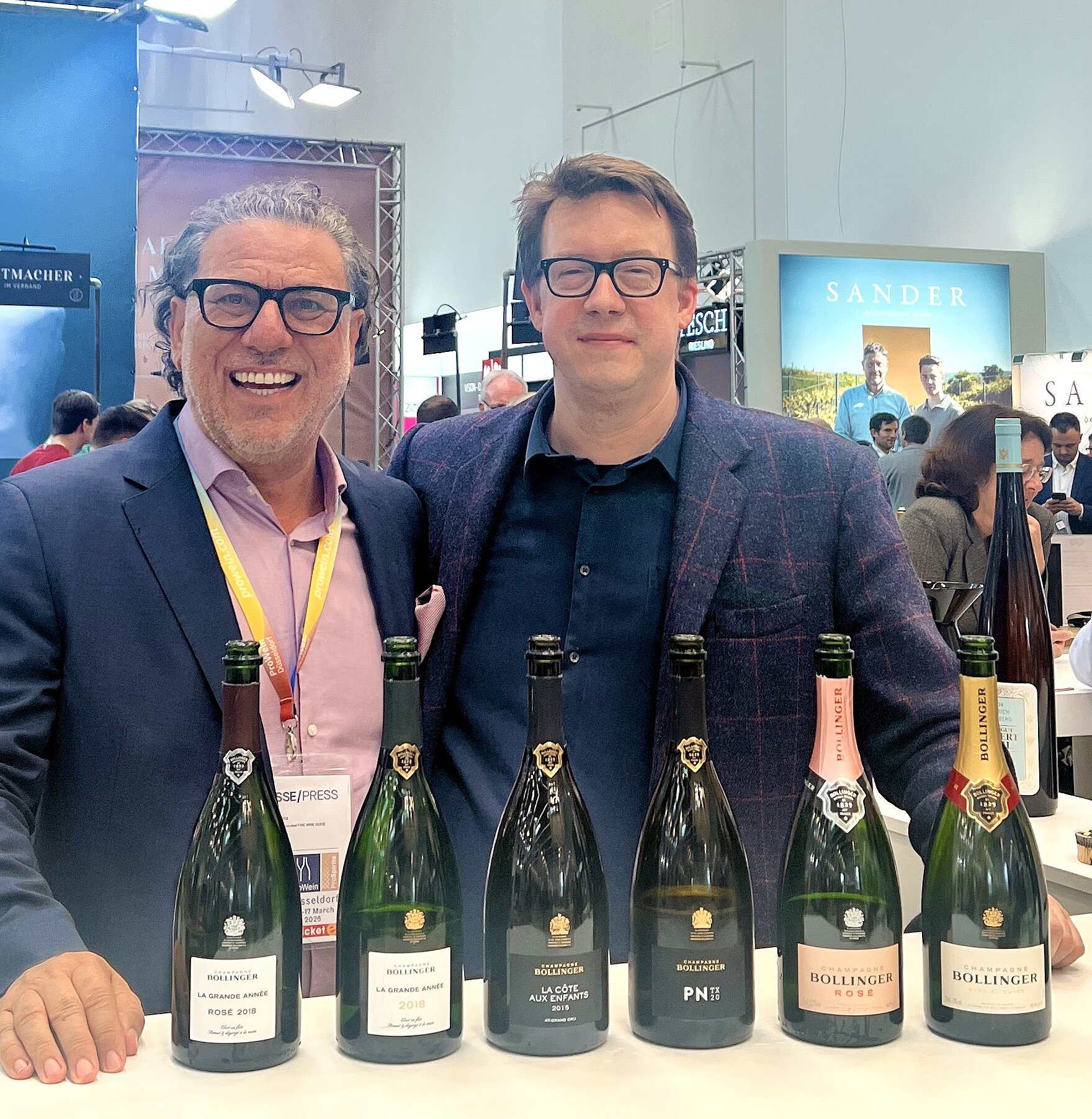 Chefredakteur und Herausgeber Giuseppe Lauria nach Interview und Verkostung auf der ProWein mit Moritz Lüke, Geschäftsführer von Grand Cru Select, dem Importeur und Vertriebspartner von Bollinger in Deutschland.