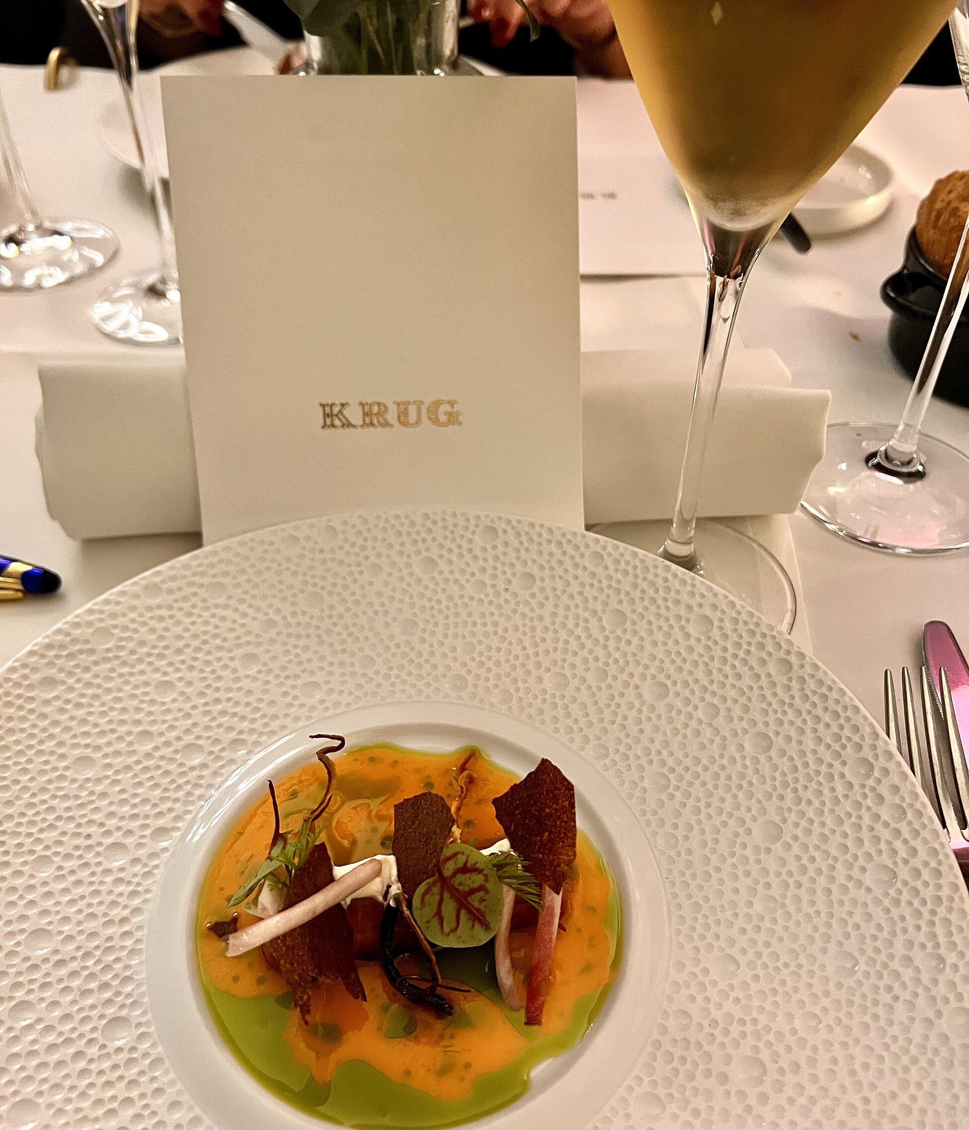 Gemeinsam entwickelten sie ein exklusives Sechs-Gang-Menü, das konsequent und gekonnt auf die großen Champagner des Hauses Krug abgestimmt war. Grande Cuvée, Rosé und Vintage – in unterschiedlichen Editionen, Jahrgängen und Flaschengrößen – zeigten eindrucksvoll, wie vielseitig und köstlich ein reines Champagne-Menü sein kann.