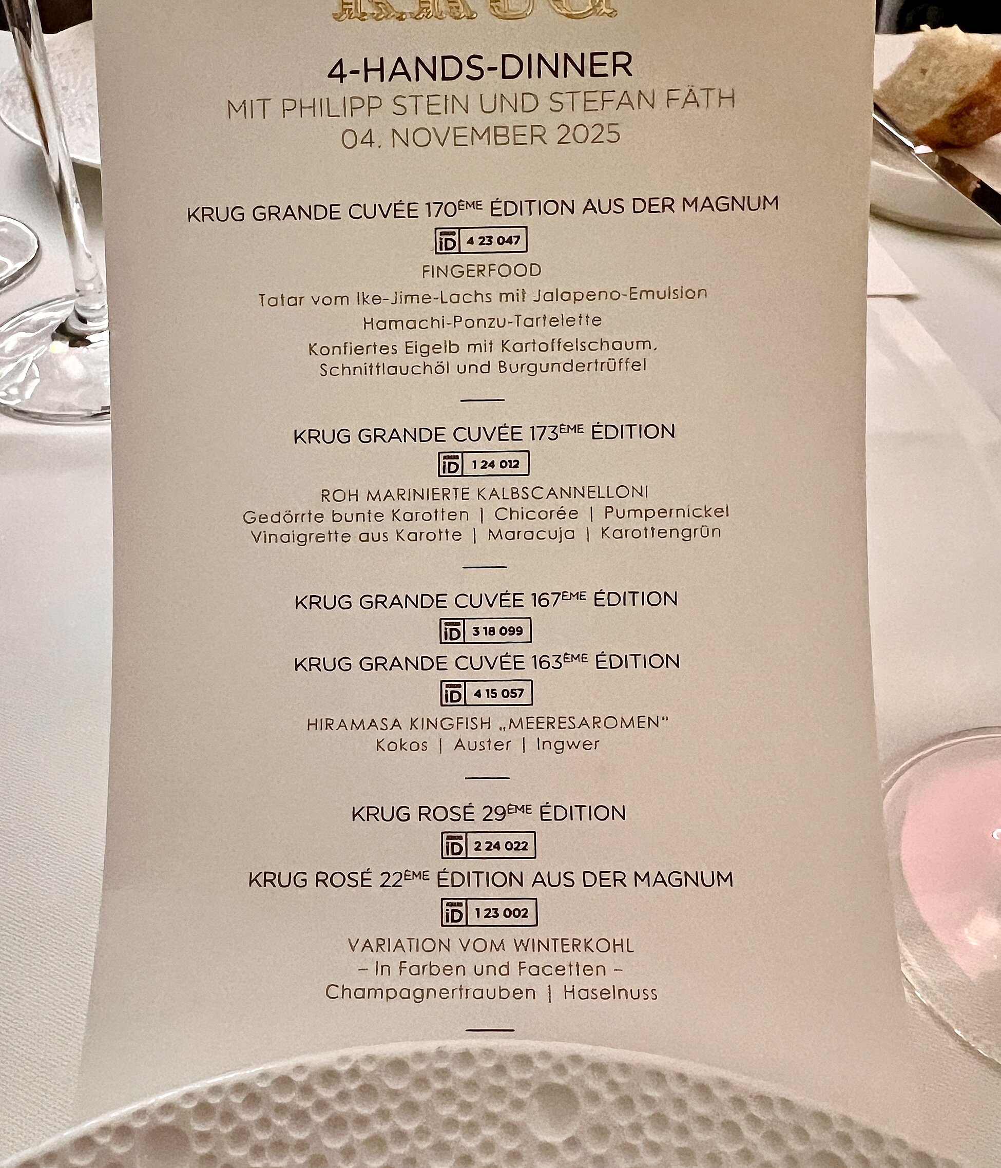 Die Nähe zur Spitzengastronomie ist bei Krug kein Zufall, sondern Teil des Brandings. Krug sucht die Bühne der großen Küche – und fand hier zwei Köche, die der Komplexität und Tiefe dieser Weine gerecht wurden.