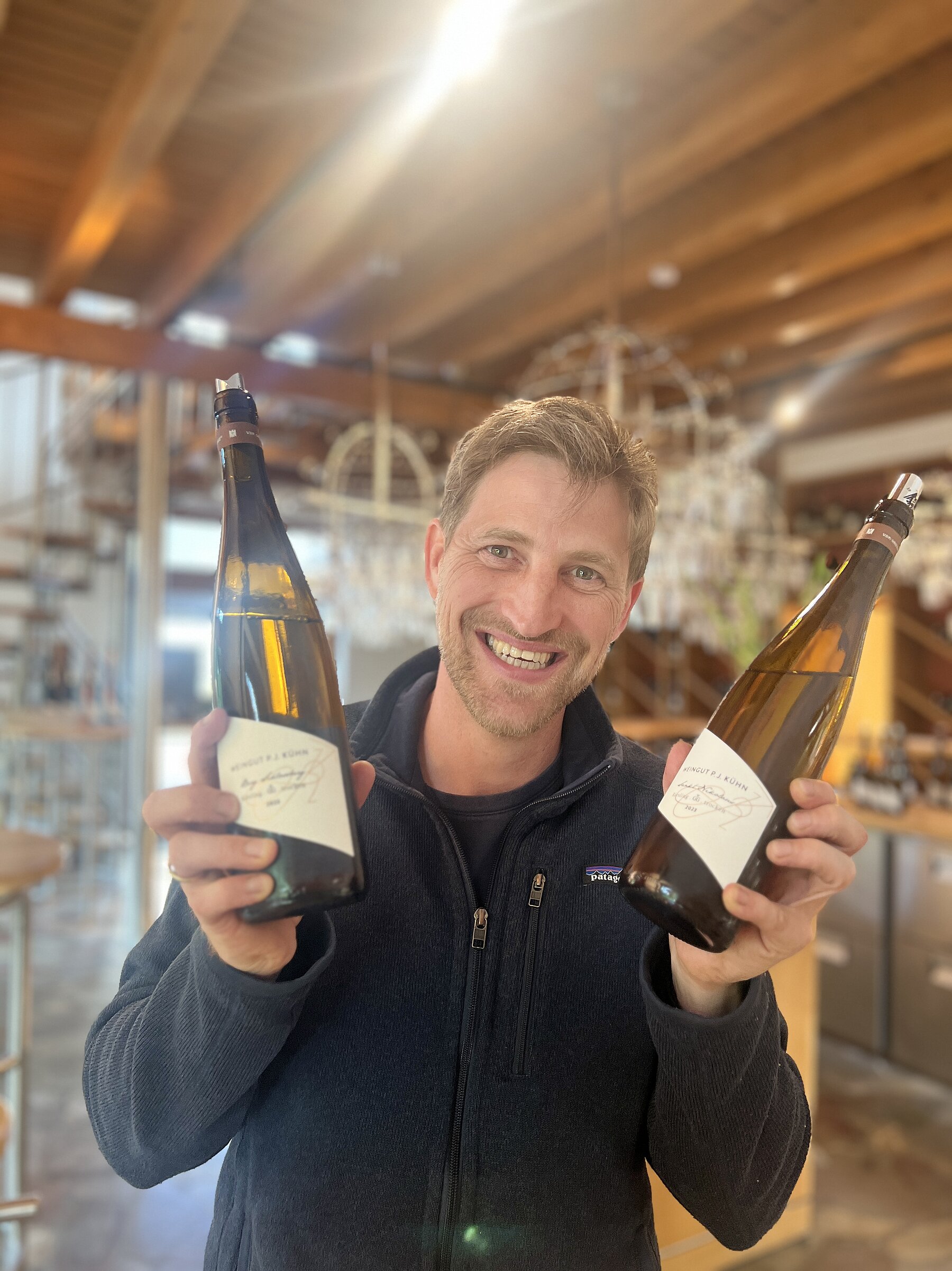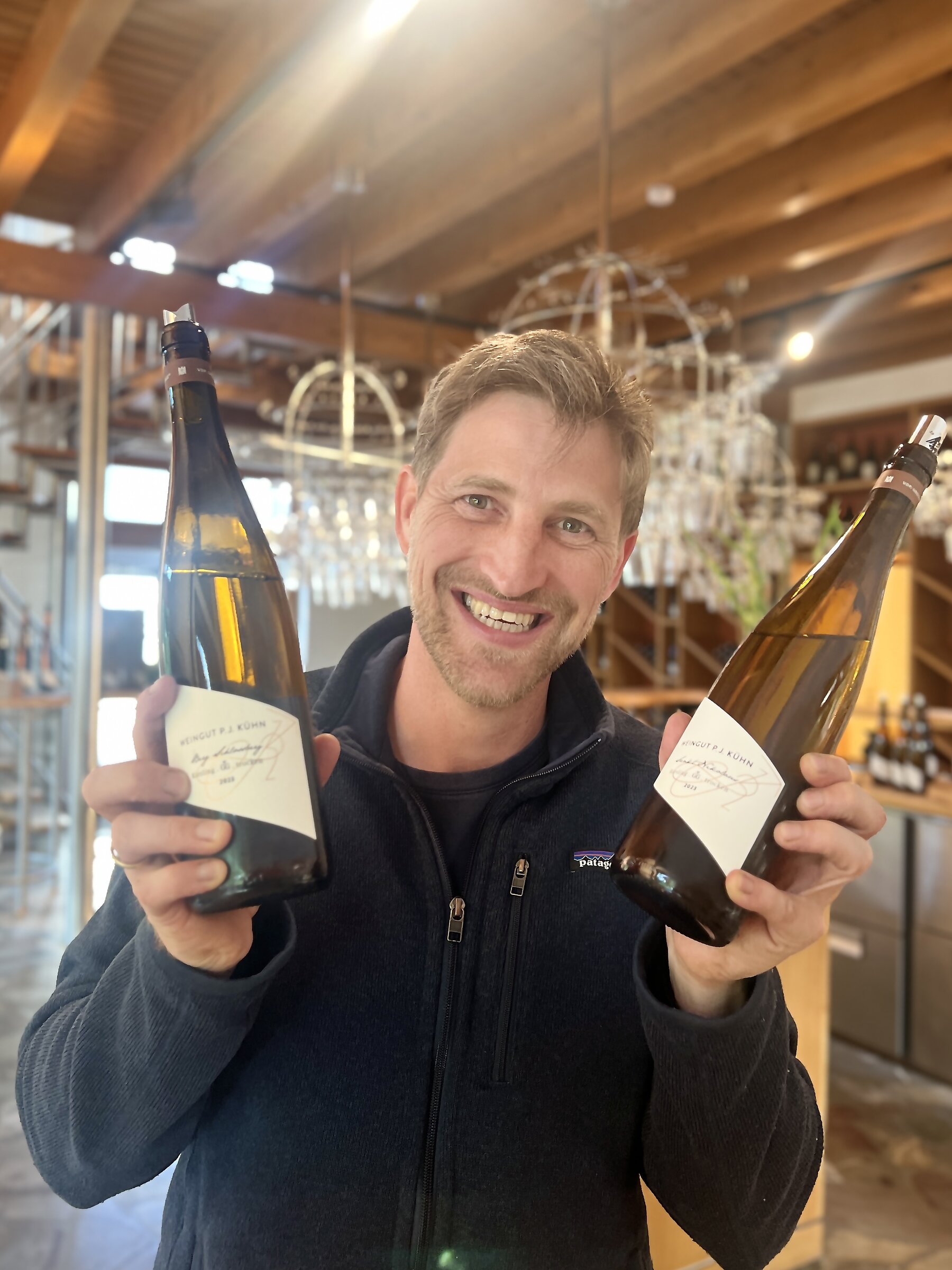 Für Peter Bernhard Kühn ist 2024 ein sehr schöner Jahrgang, der aber mit 2023 einen sehr außergewöhnlichen starken Vorgänger hat. „Es war zwar nicht Liebe auf dem ersten Blick“, sagt er mir. Dennoch ist er mit dem Jahrgangsverlauf zufrieden und sieht 2024 weit über vielen anderen Jahrgängen, sogar über 2022, auf Augenhöhe mit 2017. „Lange Zeit hatten wir ein ähnliches Gefühl wie 2023. Es gab keinen Trockenstress, moderate Temperaturen mit vielen kühlen Nächten, was – gerade für uns Ökobauern – den Pflanzenschutz vereinfachte. Von der Physiologie ist es ein sehr feiner Jahrgang geworden, der nicht viel Zucker gebildet hat. Die Säure ist präsent, aber reif. Durch den Frost sicher etwas heterogener als 2023“, fasst Peter Bernhard zusammen. Seine 2023er hatte ich bereits im Vorjahr probiert – und war damals schon begeistert. Vor allem der neue Berg Schlossberg hat für mich eine neue Benchmark gesetzt (98/100) und auch die 2024er Fassprobe zeigte sich stark (98+/100).