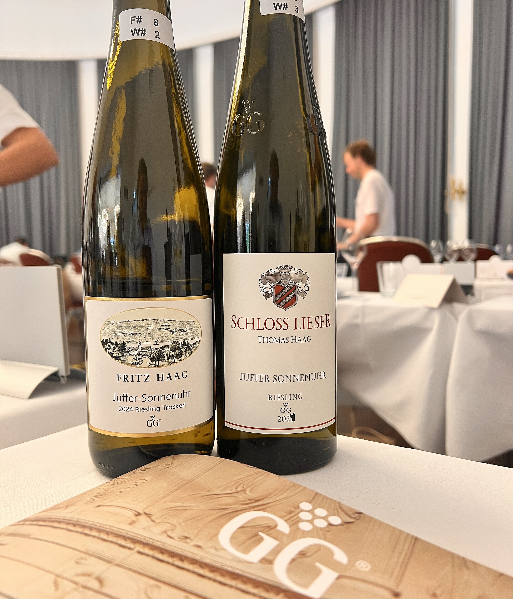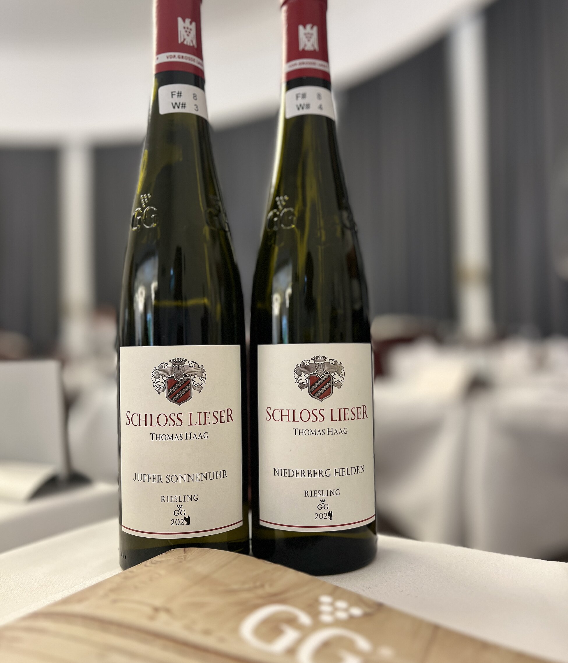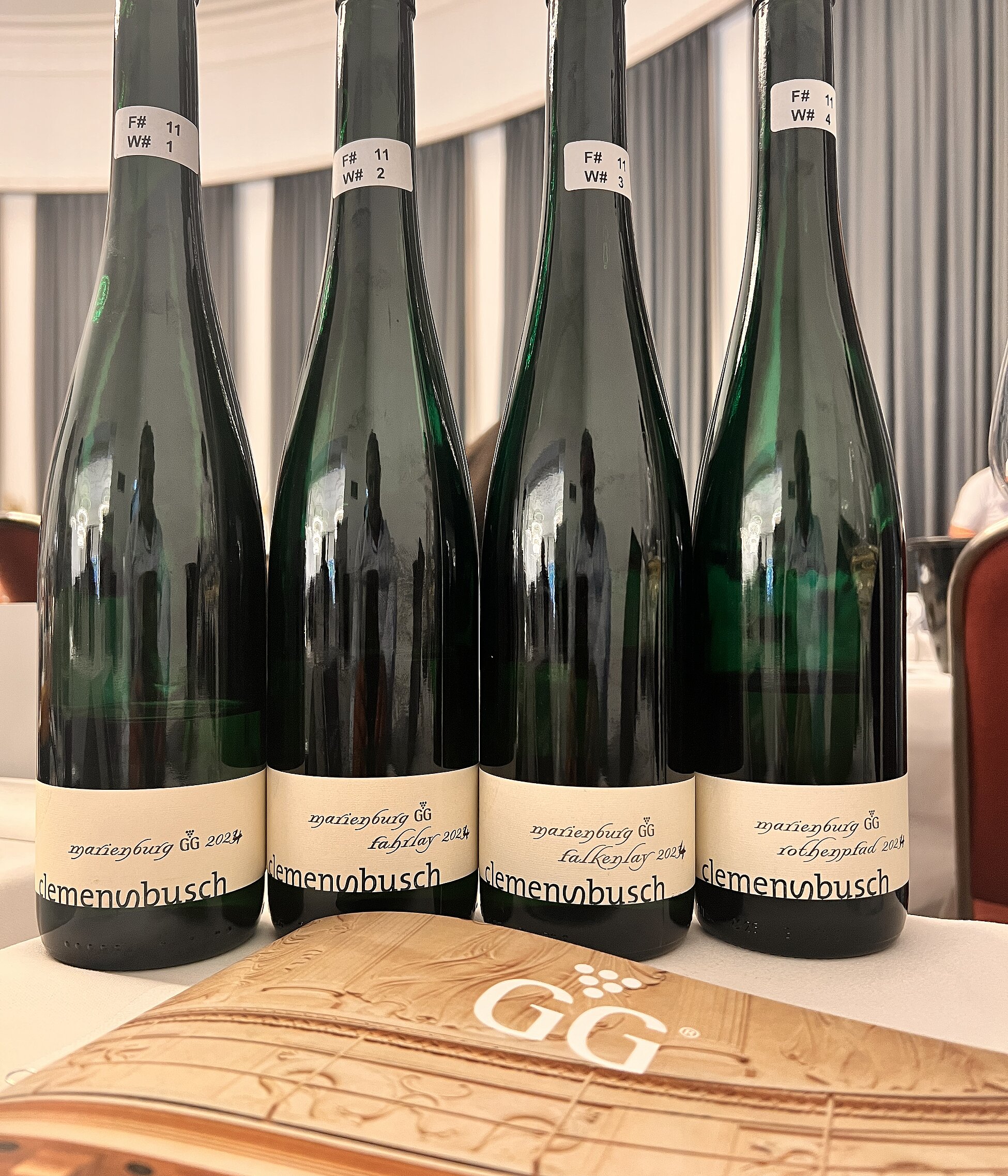 Danach kommen die Rieslinge von Heymann-Löwenstein – alles Fassproben. So etwa der Uhlen Laubach (94-95/100) und Winninger Uhlen «Blaufüsser Lay» (94-95/100) und von Fritz Haags 2024er Brauneberger Juffer-Sonnenuhr (95/100 ) sowie der Versteigerungswein Ayler Lambertskirch (93+/100) von Peter Lauer.